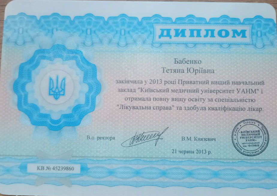 - Київський медичний інститут УАНМ, спеціальність «Лікувальна справа», кваліфікація лікаря (2013р.).
