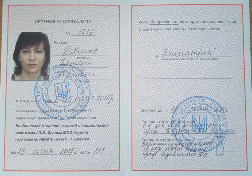 - Сертифікат лікаря-спеціаліста зі спеціальності «Психіатрія» на базі Київської медичної академії післядипломної освіти ім. П.Л.Шупика (2015р.).