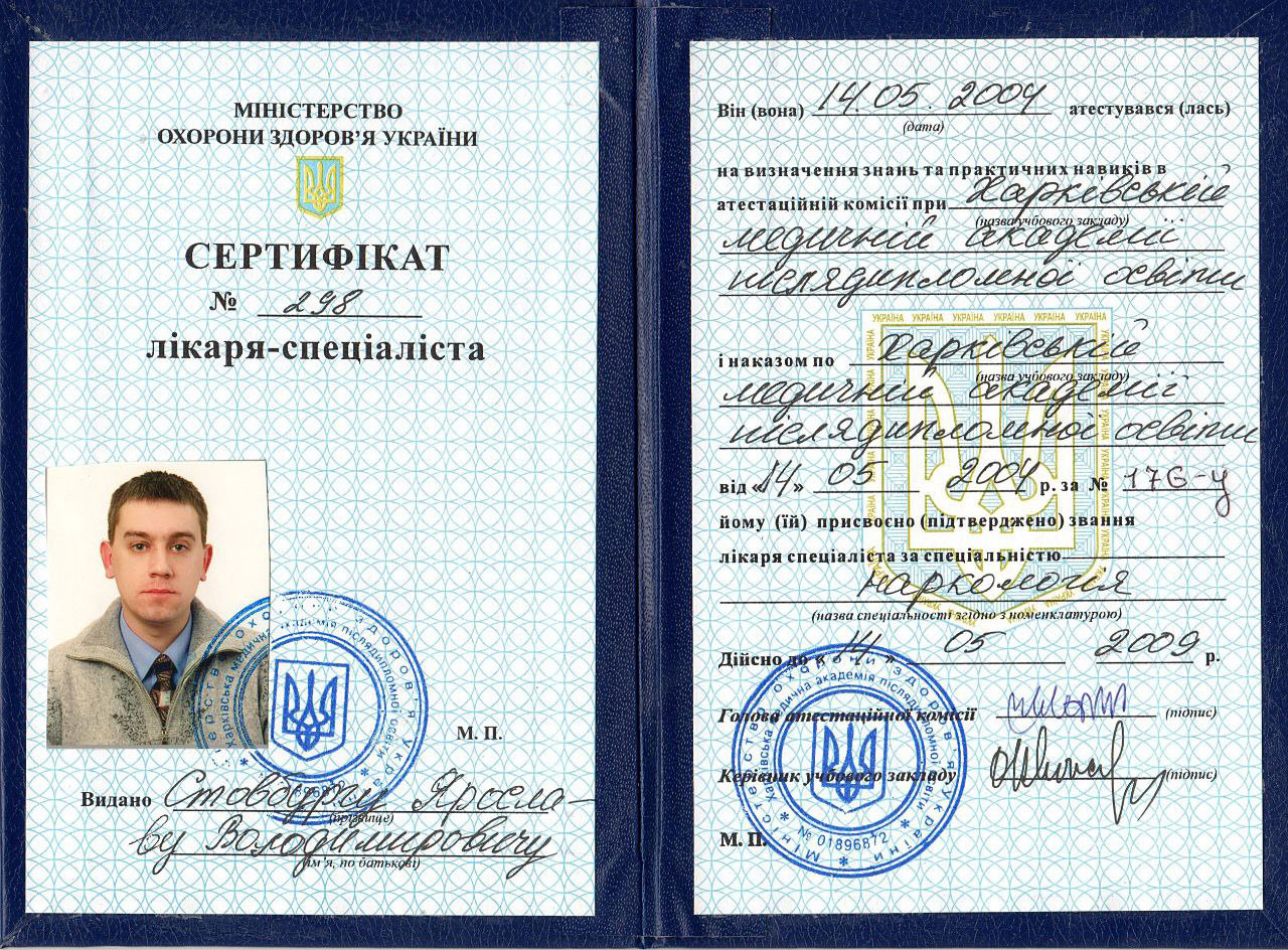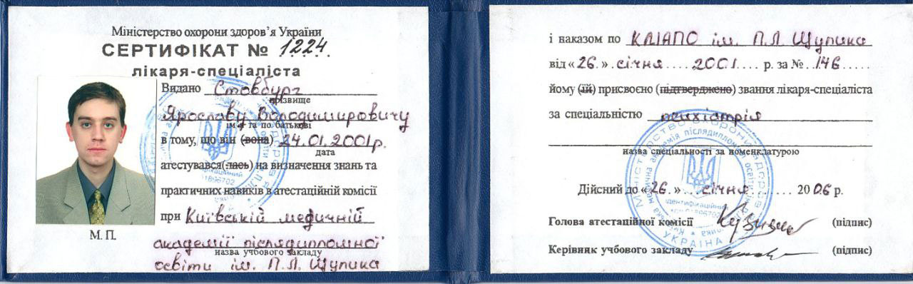 - Сертифікат лікаря-спеціаліста зі спеціальності «Психіатрія» на базі Київської медичної академії післядипломної освіти ім. П.Л.Шупика (2000–2001 рр.).